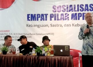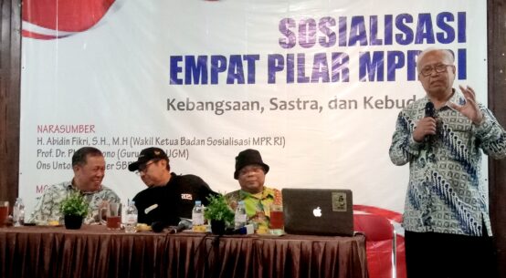PM Laksono (paling kanan) saat menyampaikan materi terkait Sosialisasi 4 Pilar Kebangsaan MPR RI (Foto: Azka Qintory) SLEMAN - Pada masa pra-kemerdekaan hingga orde baru, keberadaan sastra masih dijunjung tinggi oleh